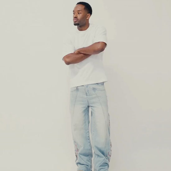 Confectionné dans un denim bleu clair délavé, agrémenté d’empiècements sur mesure à l’avant et à l’arrière. Une broderie au dos représente un chevalier sous un cerisier en fleurs, dont les branches s’étendent sur les panneaux avant. Fini avec une languette en cuir personnalisée, un mousqueton en forme d’épée gravé « VSCRTS » et plus d’un million de points de broderie.