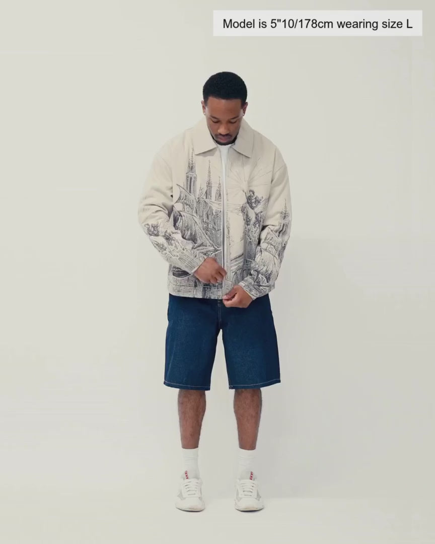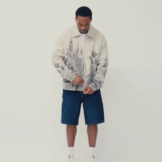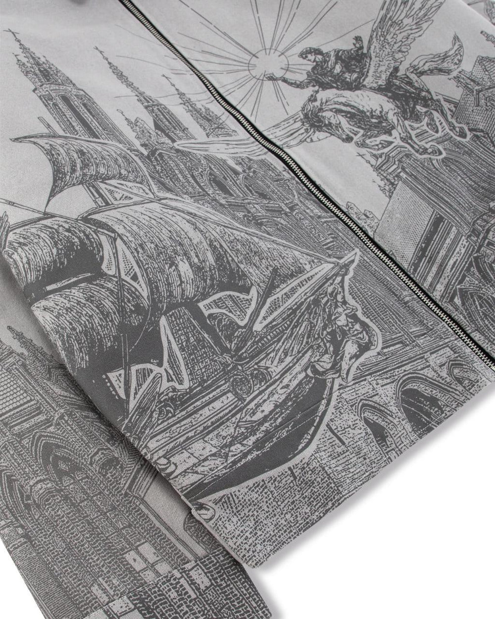 Confectionnée en toile de coton grise, cette veste se distingue par une impression spectaculaire représentant Hercule chevauchant un cheval ailé à travers un ciel mythologique. Les éléments métalliques emblématiques de VSCRTS et les ajusteurs fonctionnels à la taille apportent une touche de luxe discrète.
