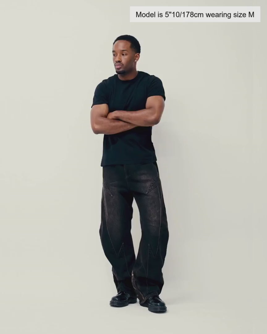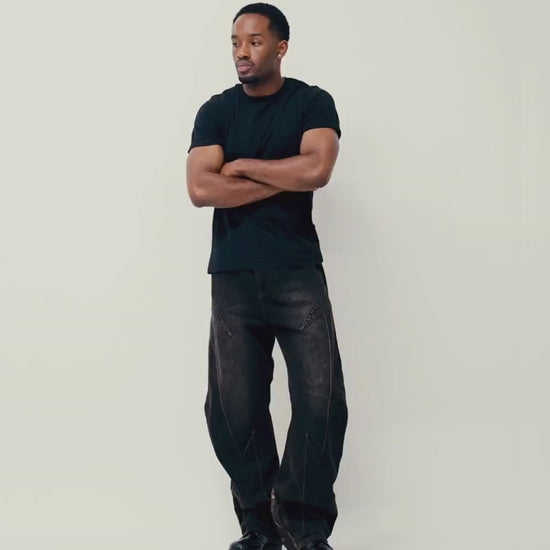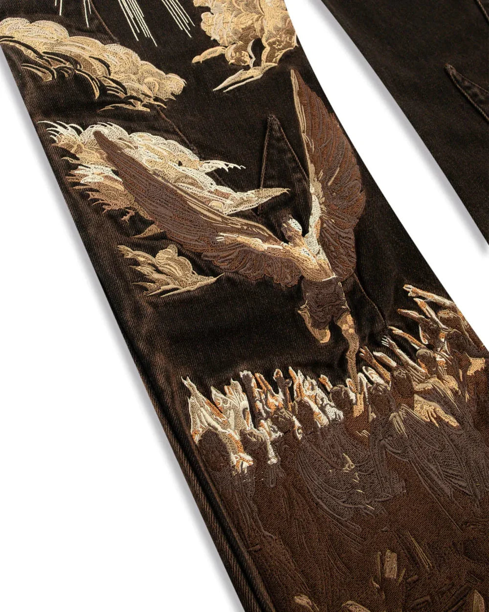Confectionné dans un denim brun foncé avec un léger délavage au niveau des cuisses. À l’arrière des jambes, se trouve une broderie de plus d’un million de points dans des tons bruns, inspirée du tableau The Lament of Icarus. Fini avec des empiècements sur mesure et une languette en cuir embossée du logo « VSCRTS » basé sur le nombre d’or.
